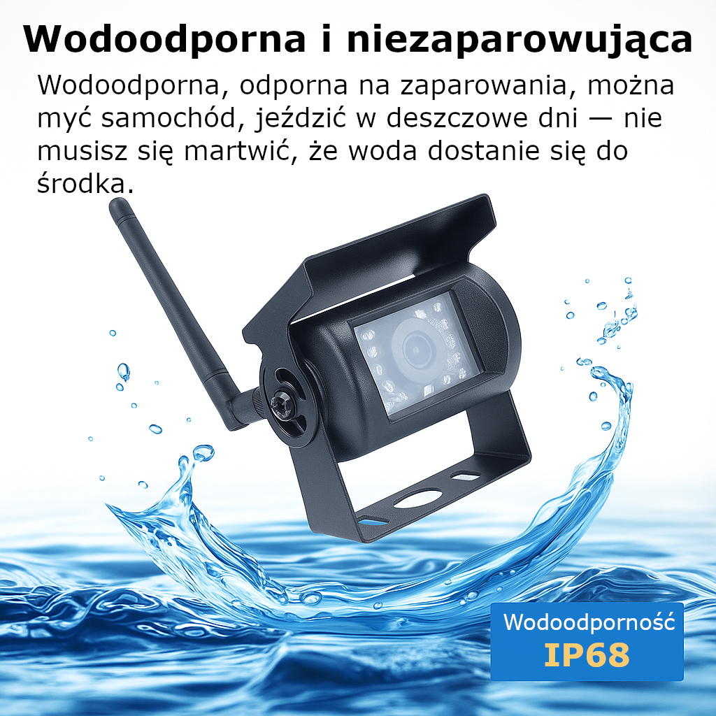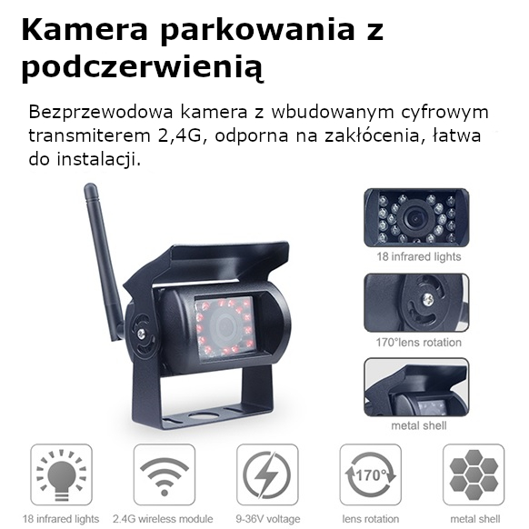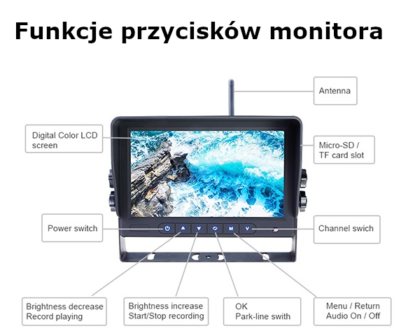 Duży, czytelny, 7” monitor w zestawie z kamerą cofania. Przesyłanie obrazu odbywa się bezprzewodowo. Wystarczy podłączyć zasilanie monitora oraz kamery.